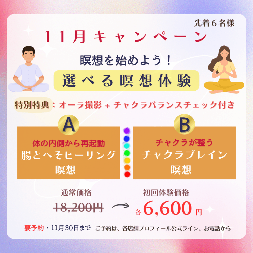 ※ 各 キャンペーンとも1回限りとなります。 また、瞑想体験とブレスレット制作は併用可