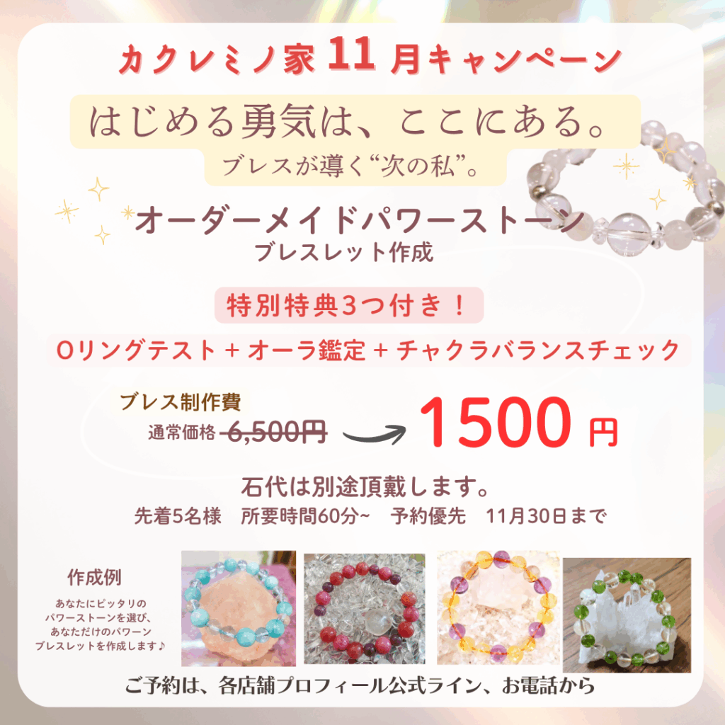 ※ オーラリーディング、パワーストーンブレスレット制作はご予約優先になります(ご予約のない場合、お待ちいただくことがありますことをご了承くださいませ)