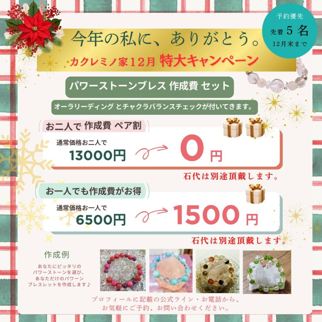 ※ オーラリーディング、パワーストーンブレスレット制作はご予約優先になります(ご予約のない場合、お待ちいただくことがありますことをご了承くださいませ)