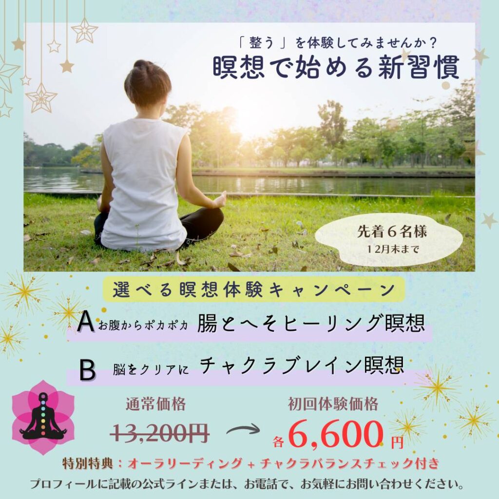 ※ ヒーリング瞑想・瞑想は完全予約制となりますので、前もってご予約ください