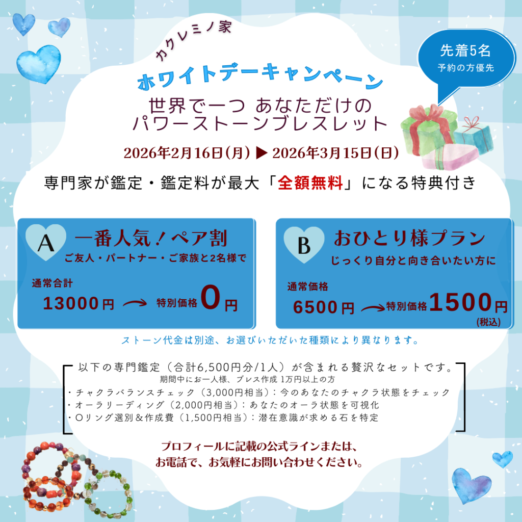 ※ オーラリーディング、パワーストーンブレスレット制作はご予約優先になります(ご予約のない場合、お待ちいただくことがありますことをご了承くださいませ)